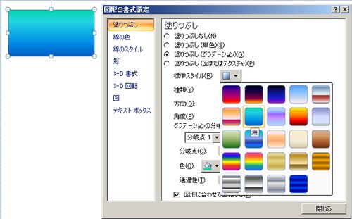 Excelで図形の淡い感じのグラデーションを作れます。 まずは図形を表示させ、塗りつぶしのグラデーションを選び、標準スタイルを「海」にしてみます。 そうすると、図形の分岐点が4つまで自動に登録されているので、分岐3、4を選んで削除ボタンにて削除し…